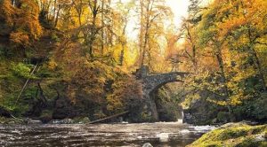and Tummel. Past the Dunfallandy Stone and into the busy Victorian town of Pitlochry. One of the town’s best-known attractions is Pitlochry Dam and Fish Ladder. Created in the 1950s the Dam has an underwater viewing chamber, which allows visitors to watch salmon navigating the specially constructed fish ladder, which bypasses the dam.